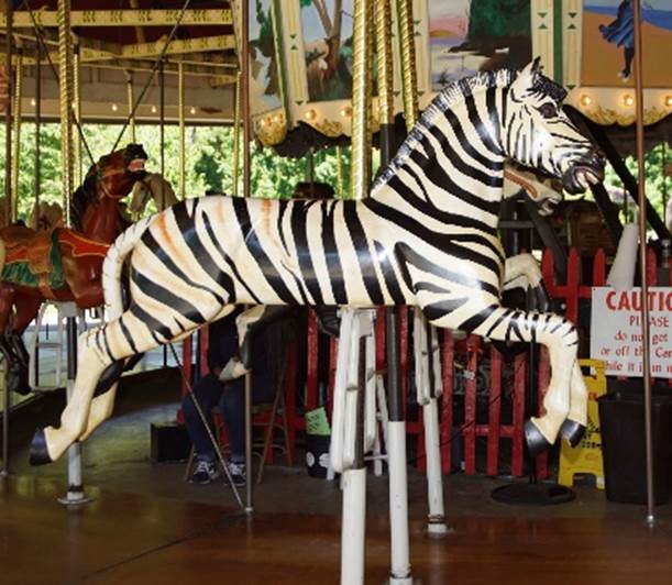 Herschell-Spillman carousel at Wheaton Regional Park has 3 rows with 33 jumpers, 3 menagerie animals (3 zebras) and 2 chariots.